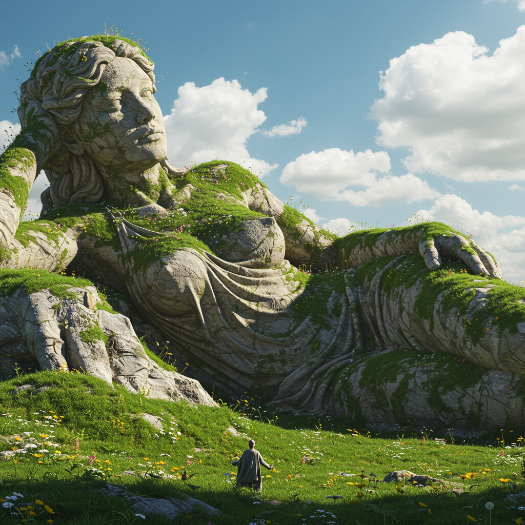 A masterpiece, best quality, official art, extremely detailed 8k wallpaper, absurdres, 8k resolution. An enormous clothed female figure reclining on her side, sculpted from ancient stone and earth, her form partially adorned with moss and patches of vibrant green grass. Her body seamlessly merges with the environment, where undulating hills and ridges emerge naturally from her limbs, and her stone garment cascades elegantly across the terrain like carved marble. Colorful wildflowers sprout from the crevices along her form, adding splashes of life. Her serene and timeless face bears the gentle marks of erosion, reminiscent of a monument delicately shaped by the elements over millennia. The lighting is realistic, featuring photoreal textures and a dramatic foreground focus, set against a sweeping and lush natural backdrop.