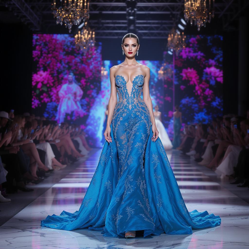 A masterpiece depicting a breathtaking female model poised at the end of a runway, a vibrant fashion show unfolding in the background. She is adorned in a stunning and elegant full-length gown, exuding sophistication. The scene is captured in sharp focus with intricate details, enhanced by cinematic lighting, all rendered in 4K UHD for a truly captivating visual experience.