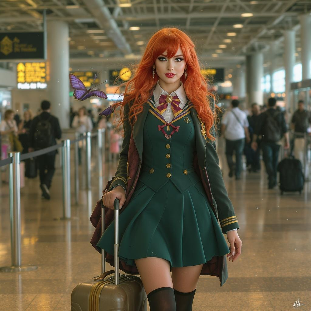 A masterpiece depicting a mid shot of an elegantly dressed woman with striking orange hair holding a suitcase, her attire and style reminiscent of Harriet Powers' artistry. The digital artwork features a hyperrealistic schoolgirl look with a magical school student uniform, complete with a skirt and high socks, evoking the feel of a promotional still from a live action movie. Set against the bustling backdrop of an airport interior, the scene captures the essence of a photo still, with the subject exuding an air of mystery and charm, as if she's on a magical journey. Trending on CG Society, this artwork merges realism with a touch of fantasy.