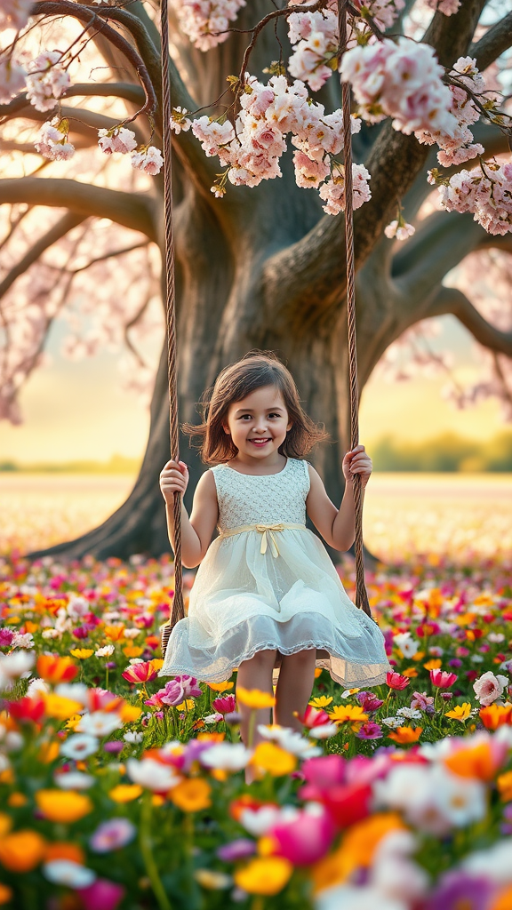 A masterpiece depicting an enchanting scene of a young girl on a swing beneath a grand tree, surrounded by a vibrant sea of colorful spring flowers. The high-quality image is bathed in soft, volumetric lighting, capturing the beauty of nature. The artwork showcases delicate and precise details, focusing on the gracefulness and joy in the girl's expression. Attention to anatomy ensures the girl's form is natural and lifelike, with every swing string visible and the composition thoughtfully balanced. The flowers spread in a dazzling array, enhancing the harmonious atmosphere. The image is pristine, avoiding blurriness or distortion, offering a captivating and serene portrait of innocence and springtime bliss.