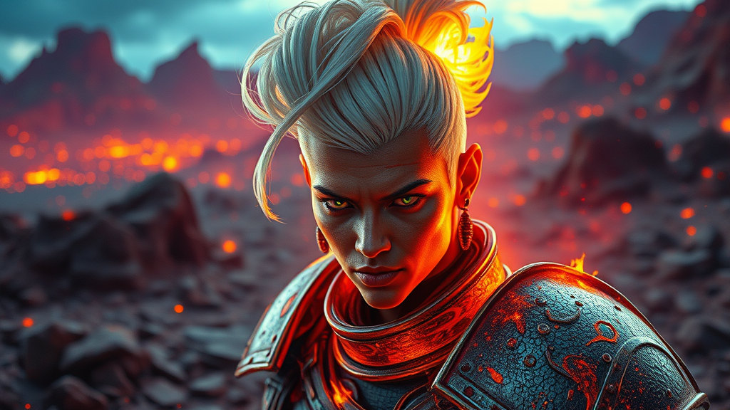 A masterpiece evoking the essence of Warhammer 40k, capturing a fire warrior with striking white updo hair and captivating eyes. The scene features vibrant and colorful cinematic lighting, placing the character on the rugged landscape of an alien planet. The setting is rich with vivid details and vibrant colors, highlighting the dynamic pose and aggressive expression of the warrior. Utilizing the sci-fi theme, the image employs the realism of a 50mm prime lens at an F/2.8 aperture, achieving a hyper-realistic and photorealistic texture in 8k resolution. The sharp focus brings lifelike clarity reminiscent of a scene rendered with the Unreal Engine and enhanced by ENB and Cinestill 800. The character is depicted with a well-structured and artistic anatomy, harmoniously integrating with the landscape, and avoiding any unnatural or distorted features.