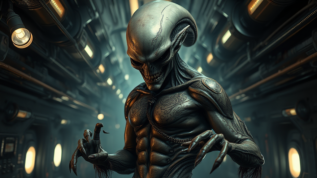 A masterpiece featuring a creepy, intimidating alien creature with unique skin and ornate clothing, set against a moist and steamy, intricately detailed spaceship corridor. This sci-fi scene is illuminated by flickering halogen lamps, embracing muted dark colors and a high dynamic range. The alien strikes an aggressive, yet alluring pose, showcasing a perfect, detailed face and an immaculate physique adorned with alien tattoos, scars, and oil-slicked skin. Its complex contours and highly detailed body reflect the textures, with wet, dripping surfaces enhancing the realism. Inspired by The Alien film franchise, the piece is photorealistic, embodying hyperrealism with an analog style in 8K UHD quality. Rendered with octane precision, it serves as concept art, featuring professional color grading with a muted LUT. Paying homage to the artistic styles of HR Giger, Hans Ruedi Giger, Aaron Horkey, and Jeremy Mann, the work avoids exaggerated details like stacked torsos or disjointed limbs, ensuring anatomical accuracy while maintaining a sense of mutation and otherworldly aesthetics.