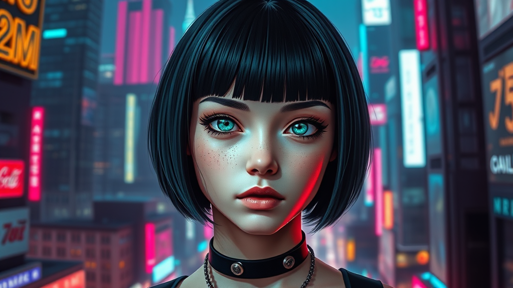 A masterpiece featuring a solo girl with sleek black bob-cut hair, gazing intently at the viewer with striking mint-colored eyes. Her face is subtly adorned with light freckles that add a touch of realism and charm. She wears a stylish choker that complements the futuristic aesthetic. The scene is set against a vivid cyberpunk cityscape, where neon lights and towering skyscrapers create a breathtaking, high-resolution backdrop that captures the essence of a bustling, darkly vibrant metropolis.
