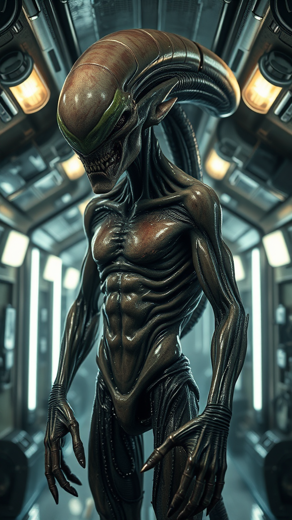 A masterpiece of a hauntingly eerie alien creature with extraterrestrial skin and attire, set against the backdrop of a humid and highly detailed spaceship corridor. This sci-fi scene is lit by flickering halogen lamps and features muted, dark colors with a high dynamic range. The alien strikes an aggressive yet alluring full-body pose, with a flawlessly detailed face and sculpted physique. Alien tattoos and scars mark its oil-greased skin, which gleams with smudges and dripping water, evoking influences from The Alien film franchise. The composition is photorealistic and hyperrealistic, with an analog style captured in 8K UHD, RAW, and octane render. Concept art is professionally color graded using muted LUTs, drawing inspiration from HR Giger, Hans Ruedi Giger, Aaron Horkey, and Jeremy Mann. The creature's complex form features subtle mutations and elaborate details across its reflective, wet skin, with creative deviations that maintain the essence of surreal, otherworldly beauty amidst the grotesque.