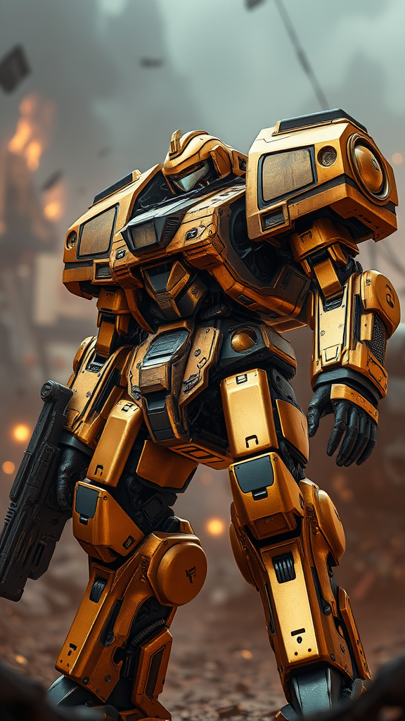 A masterpiece of an epic realistic combat robot, inspired by the grandeur of Warhammer 40,000, adorned in golden colors and intricate details. It stands amidst a complex background that evokes the dramatic intensity of its environment. The scene is lit with warm, cinematic lights that create a faded, hyperdetailed atmosphere, highlighting the robot's armored precision and advanced weaponry. This artistic depiction captures the essence of a well-armed mechanical warrior, presented with HDR realism and a touch of creative flair.
