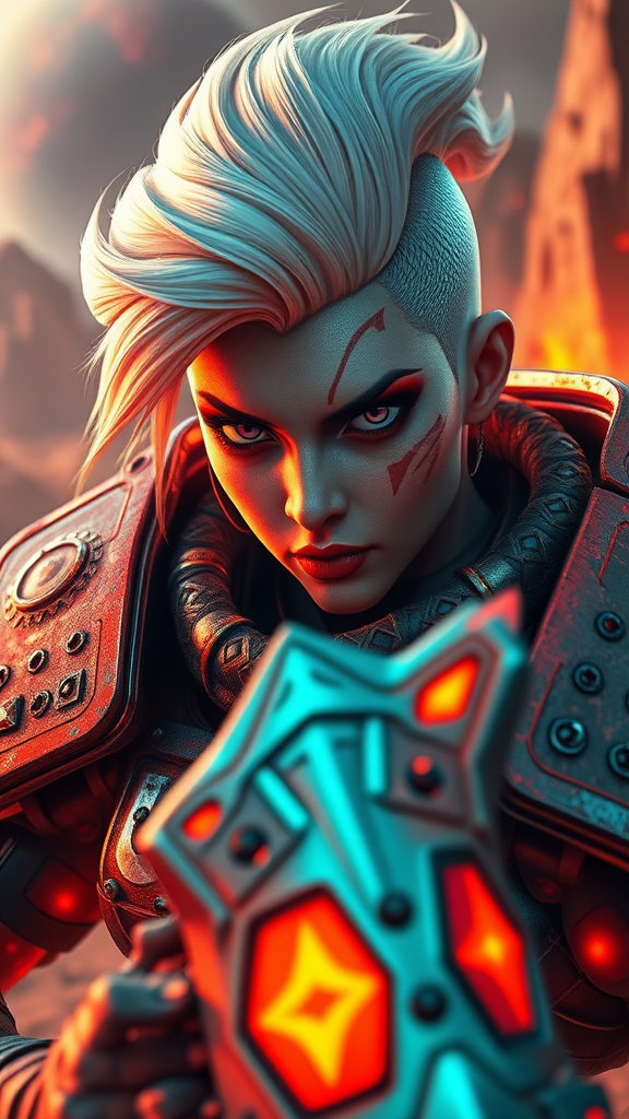 A masterpiece of best quality with realistic, colorful cinematic lighting, depicting a fire warrior with striking updo white hair and pretty eyes in a vibrant display. This fanart of a Shas Warrior from Warhammer 40k showcases vivid details and vibrant colors, set against the backdrop of an alien planet's landscape. The dynamic pose and aggressive look bring complexity to the character, enhanced by sci-fi elements. Captured with a 50mm prime lens at F/2.8 aperture, the scene is hyper-realistic, featuring lifelike textures and photorealistic details in 8k resolution with sharp focus. Rendered using unreal engine and ENB, the artwork evokes the qualities of cinestill 800 film, emphasizing a stunning, immersive experience without imperfections or distortions.