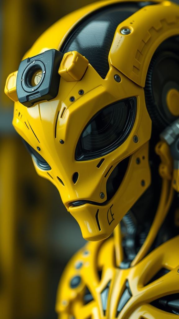 A masterpiece of superior quality showcasing a yellow and black alien 3D model, inspired by surreal cyberpunk iconography. This close-up shot captures the essence of steelpunk and dieselpunk aesthetics, employing techniques akin to photobashing. The image, shot with a Leica R8, boasts 8k resolution, UHD, and HDR for unparalleled clarity and detail. The visual experience is intentionally free from flaws such as low quality, blurriness, cropping, low resolution, jpeg artifacts, and unwanted elements like text, signatures, or any identifying marks. A single, focused perspective is maintained, ensuring nothing is out of frame for a captivating view.