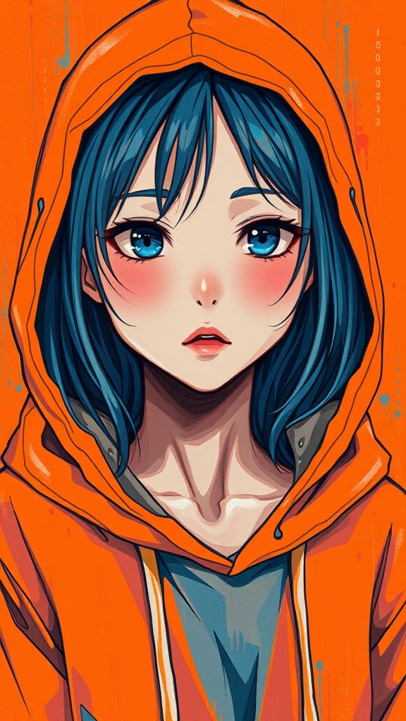 A masterpiece of surrealism, with intricate detailing, capturing the essence of anime in a portrait painting of a girl. The artwork is bathed in an orange and blue color palette, featuring a hoodie rendered with bold brush strokes. It incorporates a binary code motif and a painting-like texture, accentuated by heavy inking. The piece is reminiscent of featured art on Pixiv, showcasing saturated hues of red and blue. With a hypercube influence and a pixelsort technique, the composition is epic in both scope and proportion, enhanced by dynamic lighting in high definition.