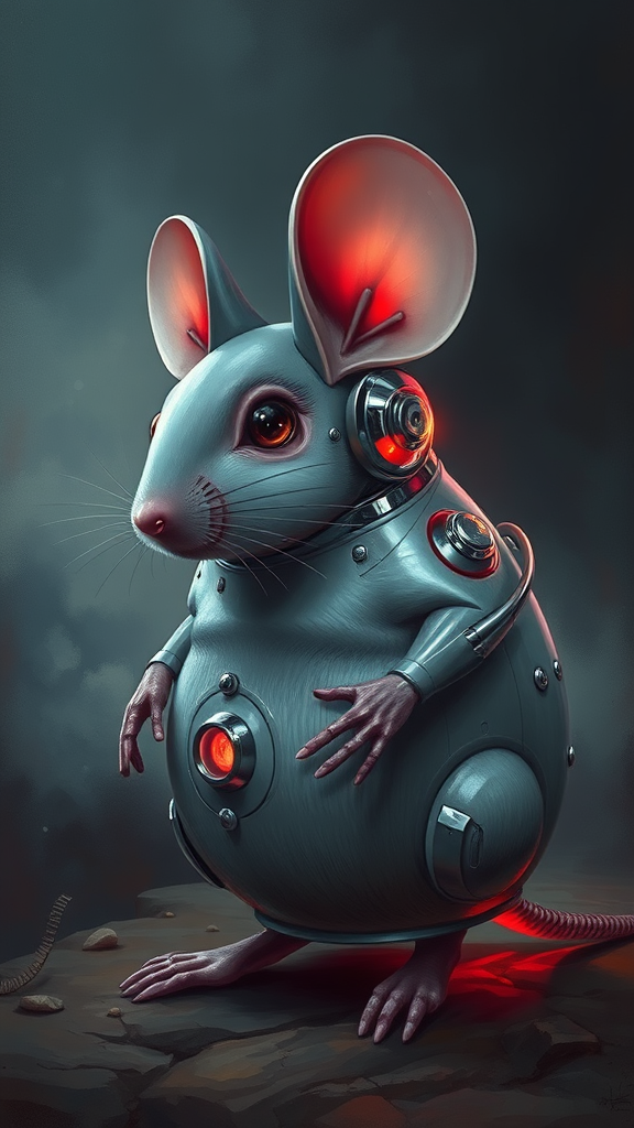A masterpiece oil painting depicting a 1950s retro-futuristic android mouse with a portly physique and prominent ears, rendered in muted colors with chrome accents and a subtle red bioluminescent glow. Set against an atmospheric backdrop, the scene captures a divine, moody color scheme with high detail, reminiscent of award-winning, trending ArtStation illustrations. The artwork features sharp focus and the cinematic lighting of an octane render, portraying a blend of nostalgic futurism and intricate artistry.