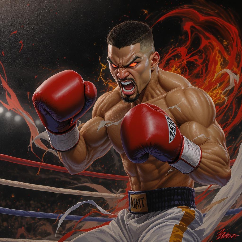 A masterpiece painting of a man with a powerful chin in a dynamic pose, centered in a boxing ring, capturing the intense energy of punching in a hyper-detailed anime style. The artwork is reminiscent of trending creations on Artstation, influenced by the dynamic styles of Jazza, Rossdraws, and Kawacy, with elements perfect for a card game illustration. The detailed portrayal channels the unique flair of Sachin Teng with an anime style twist inspired by Will Smith, perfect for a striking profile picture.