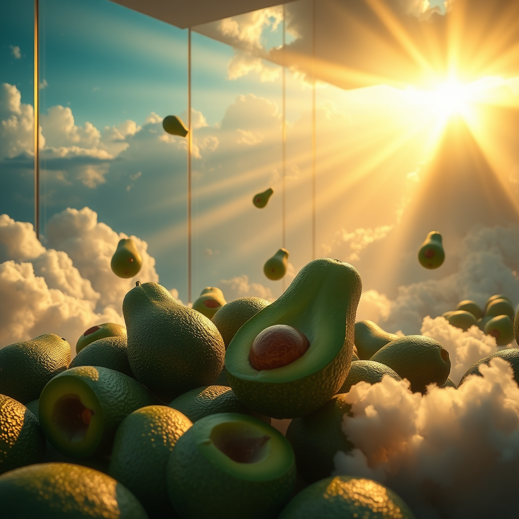 A masterpiece scene unfolds in the waiting room to heaven, with avocados floating gracefully amidst ethereal clouds. Brilliant god rays pierce through, casting cinematic lighting across intricate details. The composition exudes genius, capturing the serene essence with astonishing beauty in 8k resolution.