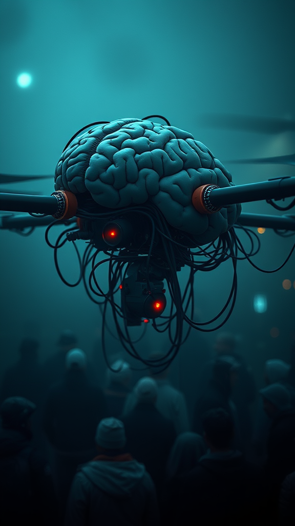 A mechanical and organic drone shaped as a human brain, intricately detailed with wires and electronic cables, scenes reminiscent of a film's atmospheric narrative. Presented in a dark, muted palette of deep blue and grey, evoking Frostpunk aesthetics. Captured with a Samyang AF 14mm f/2.8 RF lens and a Nikon D850, the imagery is a highly detailed, layered composition, akin to narrative diptychs. It features crowded scenes, shot with the rich, nostalgic tones of Kodak Ektachrome film, enhanced by dramatic lighting that casts moody shadows. The atmosphere is gloomy and foggy, creating a dramatic tension, while small creative modifications add subtle layers to the visual story.