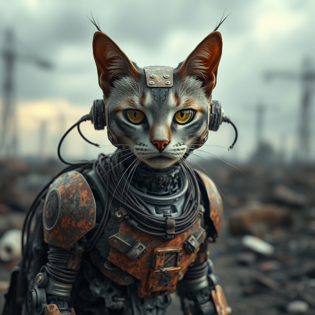 A mechanical cyborg cat with rusty, aged armor and worn metal textures stands against an apocalyptic backdrop. Its body, a fusion of robotics and organic elements, is intertwined with wires and cables, enhancing its eerie presence. The creature gazes directly at the viewer, its eyes piercing through the detailed, realistic depiction. Captured in high-resolution, the portrait showcases detailed skin and textures under diffused soft lighting, achieving a hyper-realistic, cinematic quality. The image is sharply focused, with a shallow depth of field, presenting a full-length frame that reveals every intricate detail. Despite the mechanical and chilling aspect, the portrayal avoids visual distortions such as text errors, jpeg artifacts, and deformations, ensuring a photo-realistic representation. The artwork, free of intrusive elements like usernames or signatures, maintains a haunting, yet captivating allure with perfect proportions and anatomy.