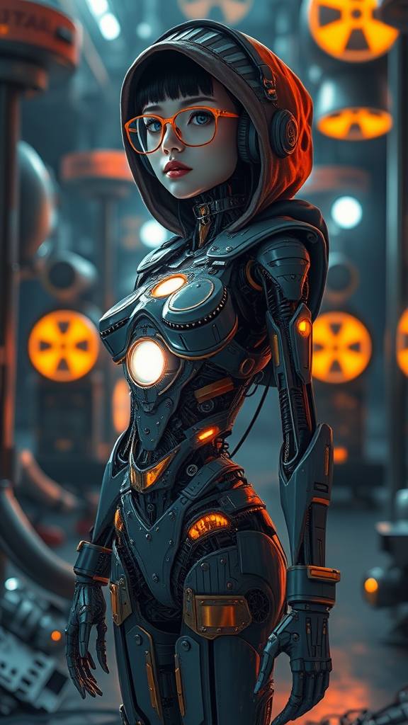 A mechanical cyborg girl stands amidst a scene of nuclear art, her form marked by gloss, depth of field, and super detailed features. The setting is illuminated by cinematic, cyberpunk lighting from multiple sources, enhancing the intricate rivets and mechanics of her being. She wears glasses and a distinctive headdress, while her flat chest and skinny build are accentuated by the glow from her chest. A hood partially conceals her head, from which headphones emerge, and her narrow hips and skinny frame are elevated by heels that catch the blinding light. Gold accents shimmer against her form, and her piercing eyes reflect the world around her. Despite the beauty of this scene, there's an uncanny quality, a sense of duality as if two faces or forms exist within one. But the focus remains on her, a beacon of light and technology, embodying the vision of a futuristic, cybernetic being amidst an artistic nuclear backdrop.