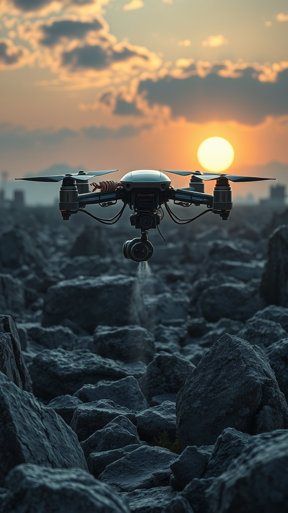 A mechanical drone disguises itself as a delicate water lily, emerging from a similarly distorted copper lung, as frosty mist seeps through the mechanical veins, connecting the drone to a maze of refined steel tendons, which course through a field of rugged gray rock formations etched against an eerie dawn sky, clouds resembling ravens, silhouetted against a cold, far-off sun, casting long shadows, where a Kodak Ektachrome photograph of a gone-by-human, lies still, surrounded by panning electronic media screens, flickering faintly with flickerless animation and backlit compressing leads, all stemming from the tender wash of tendons, reproducing cities in Origami-ed technological one-colored stream out flowing frozen vegetation reinforcing once of chilled rail atmosphere.