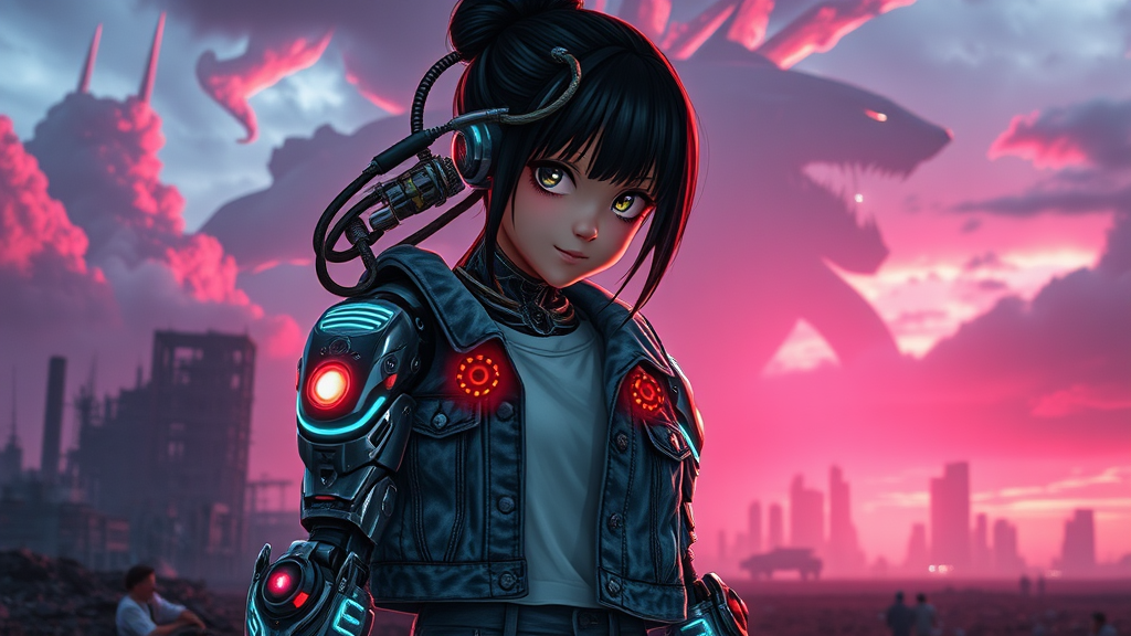 A mechanical girl with a Kidou Keisatsu Patlabor-inspired body, donning intricate bioluminescent cyborg armor crafted with detailed metal and glowing neon ornaments. Her face is highly detailed and illuminated by realistic light and shadow. She stands in a desolate, post-apocalyptic wasteland, where the ruins of a massive city are silhouetted against a sky churning with ominous clouds. A colossal creature looms in the distance, bathed in dramatic pink and violet light. Her eyes glow with intensity as she looks down, both lifted by her own mechanical limbs and connected to tubes resembling blood vessels. Her demeanor is cold and calculating, embodying the essence of a killing machine. She exudes an extremely sexy and lustful aura, wearing a denim jacket over a white T-shirt and casual pants, her black hair styled in a bun. Her expression is cold yet subtly happy as she gazes directly at the viewer. The scene, rendered in ultra-sharp detail and rich cold colors, echoes the style of Neon Genesis Evangelion, with an emphasis on intricate details and high-definition quality, capturing the essence of a cinematic masterpiece. The composition avoids flaws such as bad anatomy and poor rendering, ensuring an immaculate portrayal in a super clear, vivid picture.