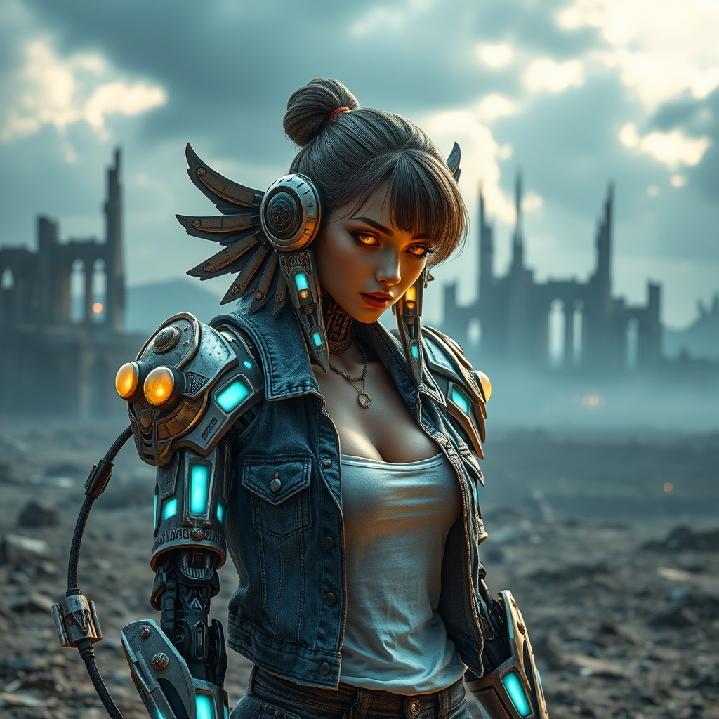 A mechanical girl with a Patlabor-like body, adorned in intricate bioluminescent mechanical armor made of metal, featuring detailed ornaments and Egyptian-inspired details. Her face is sharply detailed and realistic, with glowing eyes that convey a cold, sexy allure. She stands in a desolate, post-apocalyptic wasteland, the ruins of a massive city looming in the distance beneath an ominous sky. The lighting is cinematic and dramatic, casting shadows that play with the cold palette of neon details. Her mechanical limbs are interlaced with visible blood vessels and tubes, hinting at her origins as a killing machine. With medium breasts, her demeanor is both seductive and powerful, her eyes gazing downward authoritatively. She wears a denim jacket over a white T-shirt, coupled with casual pants, a contrast to her otherwise mechanical and lustful appearance. Her hair is styled in a neat bun, adding to her cold, calculated expression. The setting evokes the style of Neon Genesis Evangelion, with a cinematic masterpiece quality rendered in high definition. The overall impression is one of a beautifully intricate, yet deadly, machine brought to life, standing with a commanding presence, free from any artistic imperfections or errors.