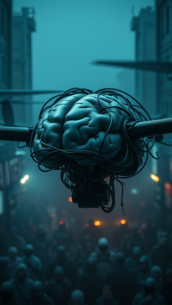 A mechanical-organic hybrid drone, resembling a meticulously recreated human brain, with intricate wires and cables intertwining, set against scenes reminiscent of a film. The setting evokes a dark, muted ambiance with deep blue and grey tones, reminiscent of the frostpunk aesthetic. Captured with a Samyang AF 14mm f/2.8 RF lens on a Nikon D850, the compositions are richly layered and detailed, featuring narrative diptychs and complex crowd scenes. The mood is enhanced by a Kodak Ektachrome photographic style, using dramatic lighting and a moody, foggy atmosphere to deepen the feeling of gloom and mystery.