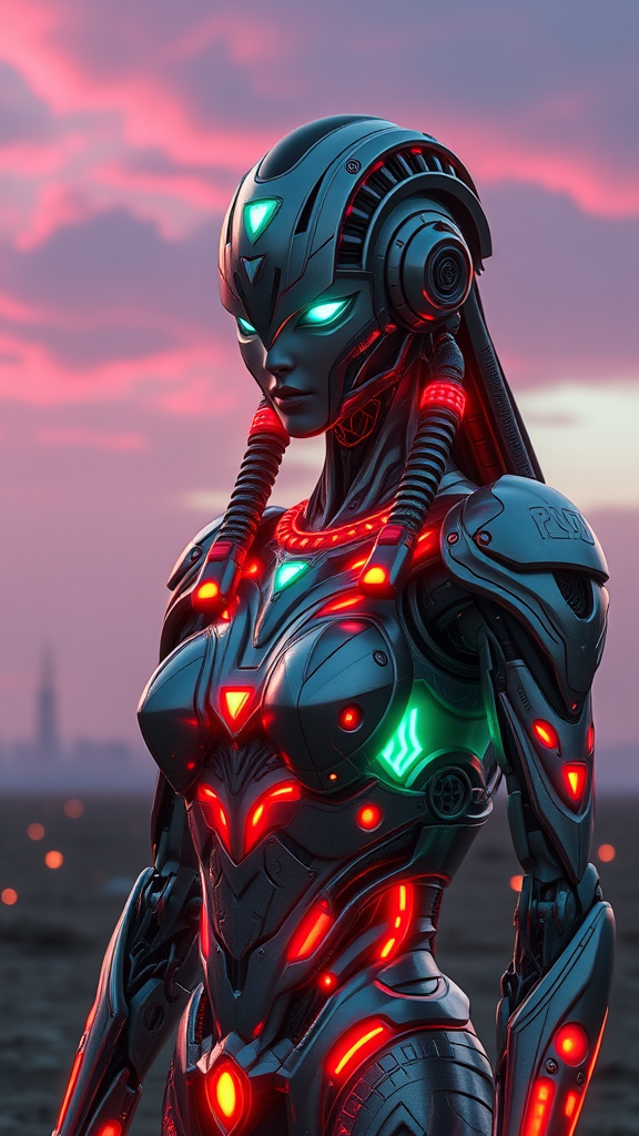 A mechanical woman with a body similar to Kiddou Keisatsu Patlabor, adorned in intricate, bioluminescent cyborg armor. Her detailed face is illuminated by global lighting, casting cold shadows in this octane-rendered, ultra-sharp 8k scene. The metallic suit features Egyptian-inspired detailed ornaments in cold colors, with realistic light effects that would trend on CGSociety. Her glowing eyes gaze down at the viewer as if lifted by her own design. Neon details accentuate her mechanical limbs, which connect blood vessels through translucent tubes, presenting her as both a deadly machine and an alluring figure. She exudes an almost ethereal allure with medium breasts in official wallpaper style. Inspired by Neon Genesis Evangelion, the setting is a desolate, post-apocalyptic wasteland, the ruins of a massive city fading into the horizon under an ominous sky. Far away, a gigantic creature stands, surrounded by dramatic pink and violet cinematic light, a masterpiece of high-quality realism. She stands with a full body in view, her black hair pulled into a bun with a cold expression on her face. Her casual denim jacket, white T-shirt, and pants seem almost out of place; however, there's a hint of happy, softer light effect, adding a layer of texture to this super-clear, high-definition picture. With elements of surrealism and creativity interwoven, and imperfections subtly modified to enhance the narrative texture while eliminating negative aspects, the scene remains compelling and emotive.