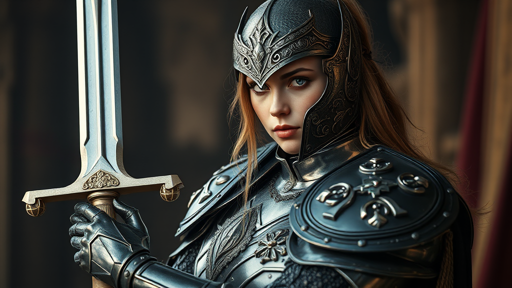 A medieval fantasy female knight clad in intricately designed metal armor, exuding elegance and strength. She holds a gleaming sword with grace, capturing hyperrealistic details and 8k ultra-realism. The scene is illuminated by cinematic lighting, emphasizing the depth of field and focused on high details. The composition maintains clarity, avoiding low resolution and imperfections. The knight is portrayed with balanced anatomy and proportions, with all elements seamlessly integrated into the frame, ensuring a polished and captivating image free of flaws or distortions. A majestic portrayal of strength and beauty.