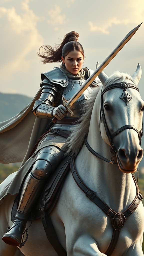 A medieval female knight in action, astride a majestic white horse, striking a heroic pose with a detailed face and expressive eyes, embodying a masterpiece in best quality 8k, radiating photorealism. Inspired by the artistry of Jeremy Mann, Sandra Chevrier, and Maciej Kuciara, her form is captured with sharp, realistic precision and true-to-life shadows. She wields a gleaming sword with determination, amidst an epic landscape. Despite its low resolution and pixelated texture in certain elements, the scene retains its powerful, dynamic essence, evoking a sense of timeless valor and strength.