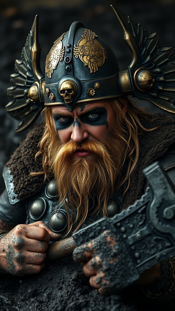 A medium closeup of a Viking king rising from thick, wet black mud, adorned with a bronze helmet featuring two large, intricately engraved wings on the sides. His war armor is embellished with menacing skull motifs. Distinctive dark war paint accentuates his fierce features, complemented by a scruffy blonde beard. His face carries a deep scar, enhancing his enraged expression. He wields a massive Viking axe in one hand. The scene is illuminated with dramatic, cinematic lighting and moody, volumetric shadows, as droplets of mud cascade off his armor and weapon.