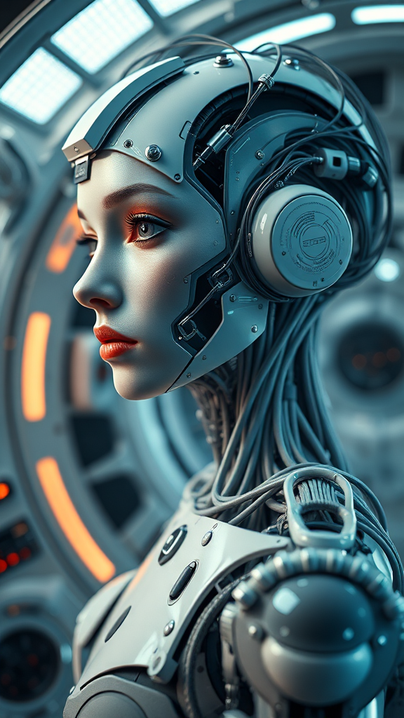 A medium long shot of a stunning woman with a porcelain robot body, showcasing a beautiful android face. Her head is intricately designed with wires and porcelain, featuring detailed eyes, skin, and robotic parts. The scene captures her in a sideways pose, highlighting many elegant robotic elements like wires and microchips. The setting is an intricately designed spaceship, rendered with octane for unmatched quality. The image is a hyperrealistic, photorealistic masterpiece, reminiscent of a model shoot with cinematic film style. The lighting includes god rays, lens flare, specular highlights, and depth of field, captured in a RAW photo using a Sony Alpha 1 with an 85mm lens at f/1.4 GM for a smooth, hard focus. The scene evokes the essence of an 8k, UHD masterpiece in the vein of A Space Odyssey, inspired by the artistry of Stanley Kubrick and Geoffrey Unsworth, without any distortions, text, or visual errors.