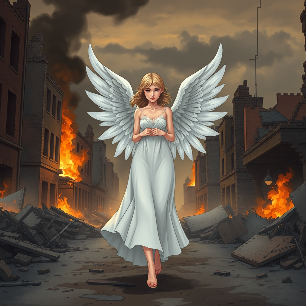 A melancholic female angel with large, elegant white wings folded gently at her sides walks through a crumbling street. Her intricate white dress flows around her, contrasting with the devastation of the destroyed buildings that line her path. The sky above is dark and ominous, and active fires flicker in the background, casting a warm glow and thick smoke into the air. Volumetric fog rolls through the scene, enhancing the eerie atmosphere, while subsurface scattering gives a soft, ethereal glow to her skin. Ambient occlusion highlights the depth and shadows in this post-apocalyptic world of war-torn ruins. Fire and smoke add to the chaos, yet there's a serene, almost unreal quality to the scene, as though pulled from a dream. The overall style is a blend of cartoon and painting, transforming the desolation into a breathtaking illustration that hints at both despair and beauty within the remnants of a broken world.