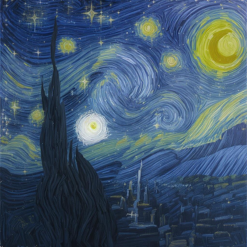 A melancholic landscape painting, evoking the essence of Van Gogh's Starry Night, with swirling cosmic stars, gentle brush strokes, and an ethereal, dream-like atmosphere. The composition is whimsical, featuring deep blues and vibrant yellows blending seamlessly across a night sky, capturing the viewer's imagination in a raw and emotive depiction of serenity intertwined with wistfulness.
