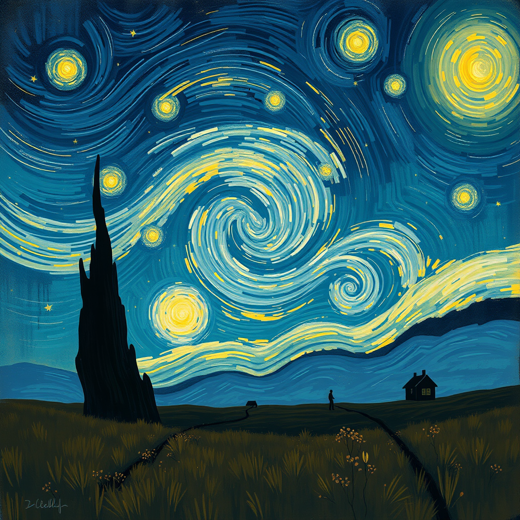 A melancholic landscape under a Van Gogh-inspired sky, where the swirling stars dance gently amidst soft brush strokes. The scene is infused with a dreamlike, whimsical quality, evoking a deep sense of nostalgia and wonder. The night sky, painted in rich blues and soulful yellows, casts a serene glow over the tranquil land below. Shadows and light play harmoniously together, creating an atmosphere that feels both ethereal and raw, capturing the profound beauty found in sadness.