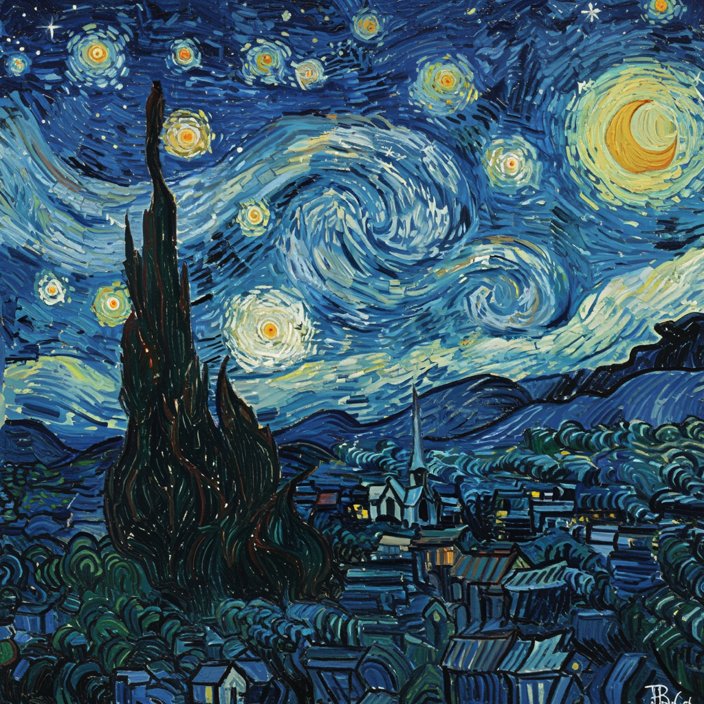 A melancholic painting imbued with the essence of Van Gogh's Starry Night, weaving a tapestry of swirling celestial bodies across the sky. Gentle brush strokes evoke a dreamlike and whimsical atmosphere, where stars dance in tender motion. The scene carries a raw, emotional depth, capturing the beauty of sorrow in a serene landscape elongated into an elegant 9:16 aspect.