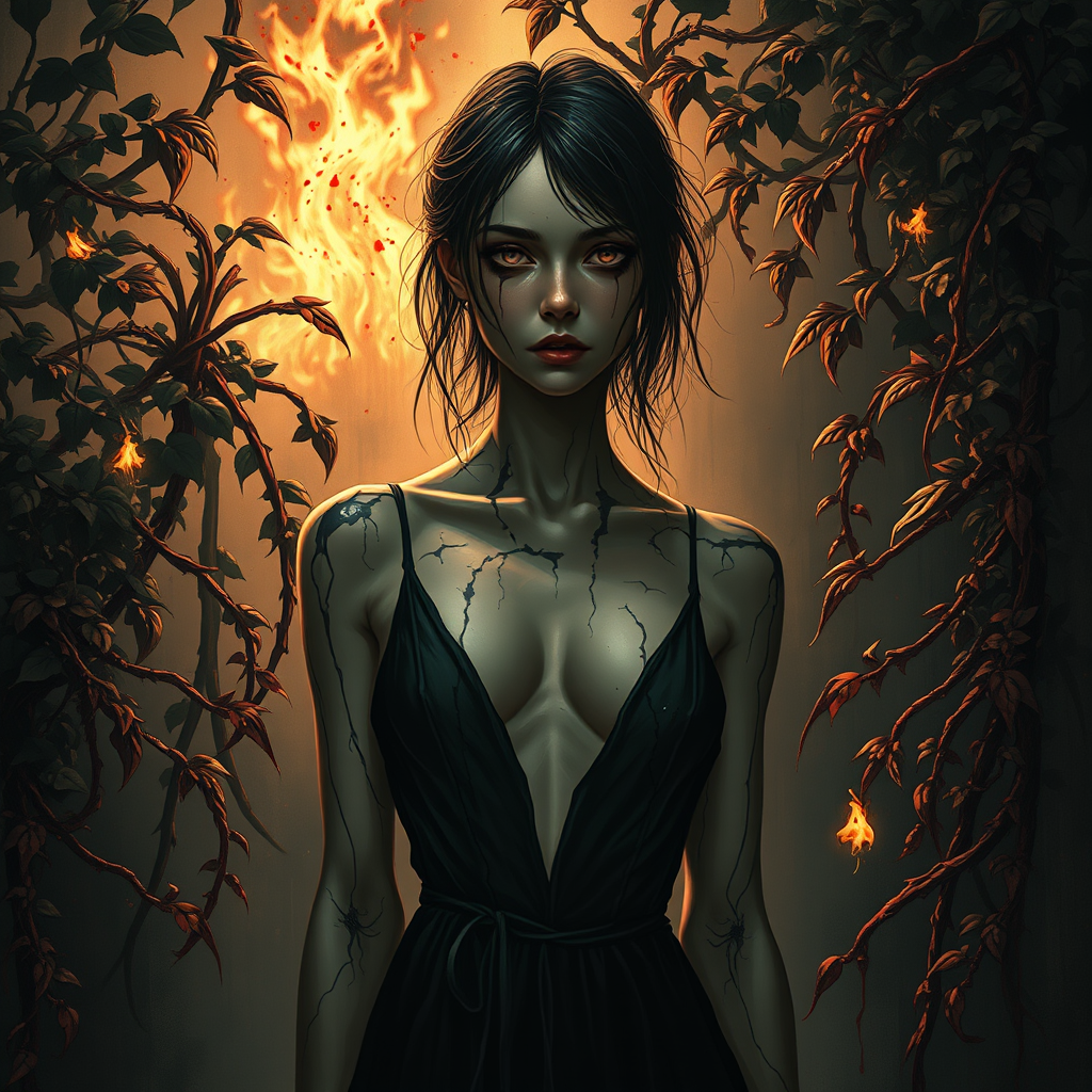A melancholic scene of a girl in a high-cut dress with black veins, her skin appearing to seep dark oil, surrounded by ominous predatory plants intertwined with lush ivy. Her face is expressive but somber, set against a backdrop of flickering fire casting dramatic, cinematic shadows. Red splashes and smudges add a sense of chaos and intensity to the atmosphere. The artwork exhibits fine art qualities with an 8K resolution, emphasizing exquisite details and texture. The lighting is an artful blend of artificial and rim lighting, enhancing the overall depth and mood.