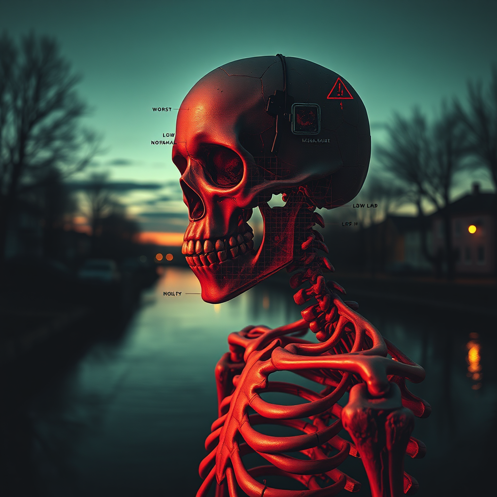 A melancholic skeleton depicted in prismatic portrait style, infused with elements of red and dadaist photomontage. Set against a backdrop of a river at dusk, the scene combines gothic natural elements with a sense of suburban ennui. Influenced by the Helsinki school, the image is an UHD creation featuring translucent layers and double-exposure. The anatomy is intentionally flawed, showcasing varying quality levels—worst, normal, and low—as well as being low resolution and slightly blurry. Text overlays and visual noise such as watermarks, logos, banners, and extra digits are present, giving a feel of cropped images with jpeg artifacts. An artist's signature and username are subtly included, with errors visible in sketch-style duplicates, creating an ugly, monochrome horror effect. Geometry and mutation blend with disgusting elements for an unsettling composition.