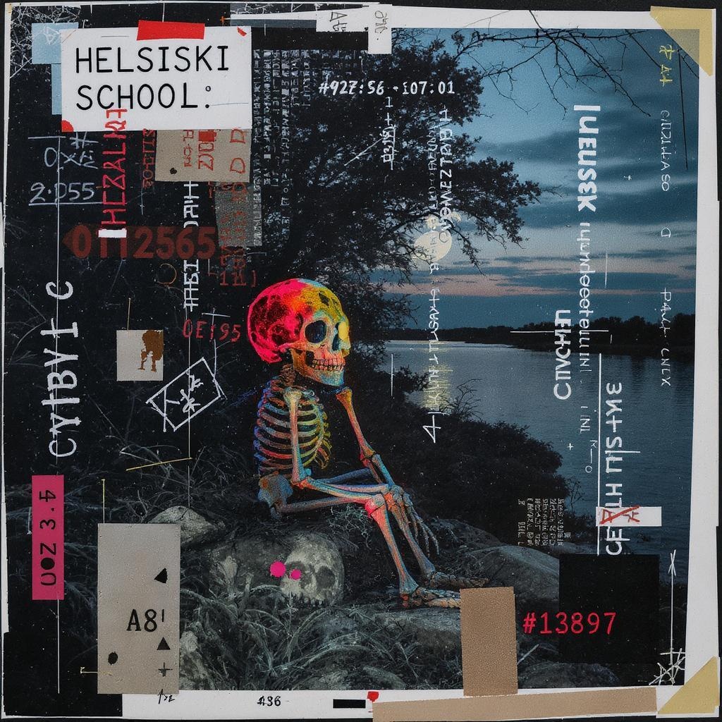 A melancholic skeleton enveloped in prismatic hues, evoking the essence of gothic nature at river dusk; a dadaist photomontage revealing suburban ennui, inspired by the Helsinki school. The scene is captured in UHD, with translucent layers and double-exposure, blending poor anatomy, intentionally flawed appearance, and varying quality. The composition is low-resolution and blurry, with elements like text, watermarks, logos, banners, extra digits, and cropped edges adding to its imperfect charm. Jpeg artifacts, sketches, duplicates, and monochrome tones intertwine with horror and geometry, creating a sense of mutated grotesqueness that's both ugly and fascinating, complete with unintended errors and an unsettling signature.