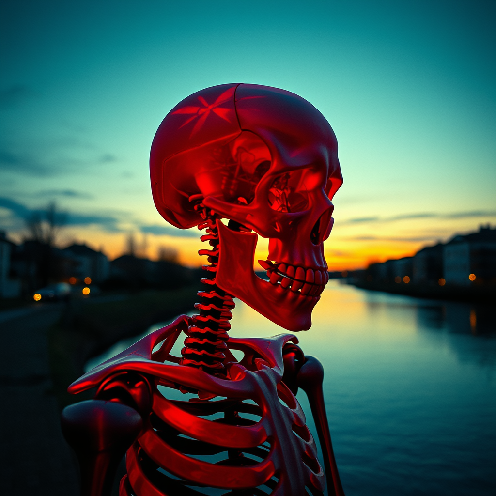 A melancholic skeleton in prismatic portrait style, infused with red hues, reminiscent of dadaist photomontage, by a river at dusk. Elements of gothic natura blend with suburban ennui, capturing the essence of the Helsinki school's unique perspective. The image features UHD quality with translucent layers and a double-exposure effect, presenting distorted anatomy. Its aesthetic combines worst, normal, and low quality attributes, appearing low res and blurry with hints of text, a watermark, logo, or banner. The composition includes extra digits, cropped sections, jpeg artifacts, an artist's signature, or username—creating an impression of error, sketch quality, and duplication. The result is an abstract portrayal that is both ugly and monochrome, evoking horror through geometric mutation and a sense of the grotesque.