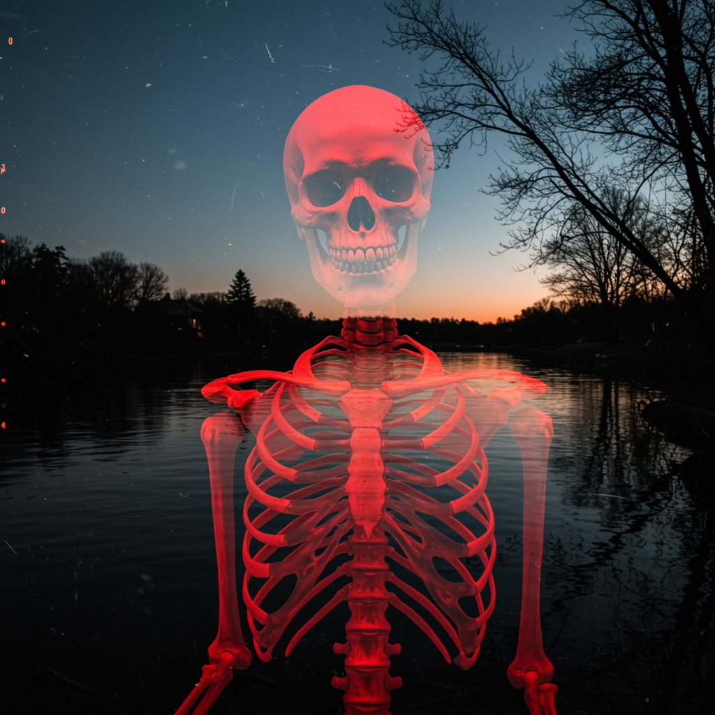 A melancholic skeleton infused with prismatic portrait style, featuring red tones amidst a dadaist photomontage; set against a tranquil river at dusk, merging gothic natural elements with suburban ennui, drawing inspiration from the Helsinki school's influence. The image is a UHD composition with translucent layers, showcasing double-exposure and distorted anatomy. It exhibits a range of qualities from worst to normal, appearing low res and blurry, with elements like text, watermarks, logos, and banners adding layers of complexity. The composition includes extra digits, cropped sections, and jpeg artifacts, accented by signature-like marks, usernames, errors, and sketch-like features. It explores themes of duplication, with an aesthetic that's ugly yet monochromatic, intertwining horror, abstract geometry, mutation, and elements that invoke a sense of the grotesque.