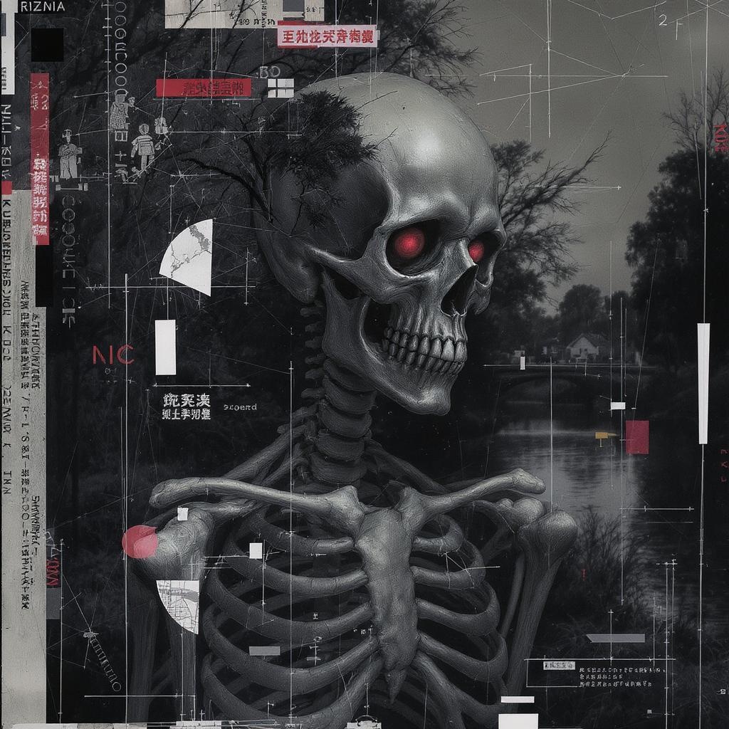A melancholic Skeleton, inspired by prismatic portraits, with a touch of crimson, dadaist collage, and a river at twilight, embodying gothic nature and suburban disillusionment, influenced by the Helsinki school. UHD image with translucent overlays, double-exposed imperfect anatomy, combining worst, normal, and low-quality elements—low resolution, blurred aspects, scattered with text, watermarks, logos, banners, extra digits, and cropped sections. JPEG artifacts, incomplete sketches, duplicates, and an unrefined, monochrome horror in geometric mutation—creating a grotesque and unsettling vision.