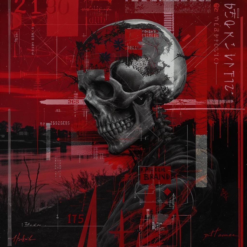 A melancholic skeleton juxtaposed in a prismatic portrait style, enveloped in hues of deep red and featuring elements of Dadaist photomontage. Set against a river at dusk with gothic natural motifs, it captures suburban ennui. Influenced by the aesthetic philosophy of the Helsinki school, the image features UHD quality with translucent layers and double-exposure manifesting bad anatomy. Its composition blends worst quality with normal quality, resulting in a low res, blurry visual; text, watermarks, logos, and banners intrude upon the scene alongside extra digits and awkward cropping. JPEG artifacts dance with signatures, usernames, and subtle errors. This disorienting sketch includes duplicates and offers an ugly, monochrome portrayal with hints of horror and unsettling geometry. Elements mutate into a grotesque, distorted image that's both fascinating and repulsive.