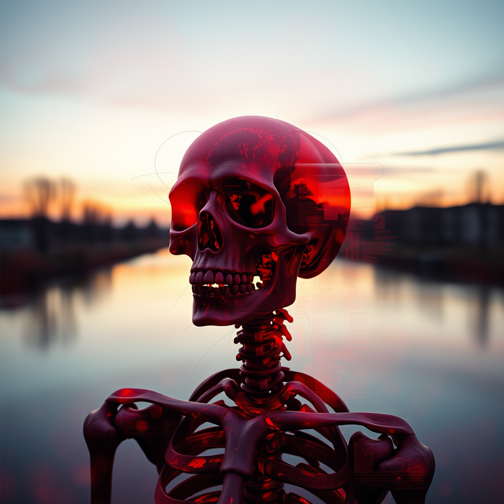 A melancholic skeleton portrayed through prismatic layers, echoing dadaist photomontage with hues of red; set against a river at dusk evoking gothic nature blended with suburban ennui. Influences of the Helsinki school evident in UHD detail, interwoven with translucent, double-exposure elements and flawed anatomy. The image reveals varying quality from normal to low, appearing blurry with text overlays and digital blemishes like watermarks, logos, and banners. The composition hints at cropping issues, jpeg artifacts, and scribbles resembling a careless signature. Duplicated forms and an ugly, monochrome aesthetic create a horror-like geometry of mutation and grotesque appeal.
