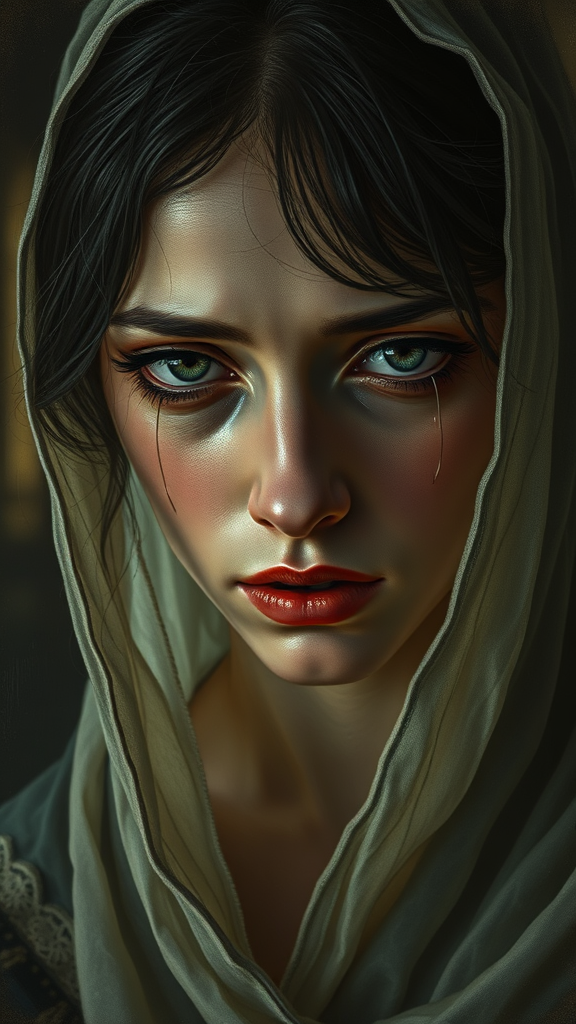 A melancholic woman, tears streaming down her face, her expression deeply forlorn. Her eyes, red and swollen, convey profound sorrow, with furrowed brows and a reddened nose adding to her grief. Her cheeks glisten with moisture, her mouth slightly open in silent lament. Her dark hair frames her face, accentuating her beautiful, intricate eyes and ears. The painting style reflects the Gothic art of French master Alexandre Cabanel, capturing dramatic contrast and shadow. Her gaze, somber and penetrating, is set against the backdrop of an ancient, dimly lit cathedral. She wears a delicate veil draping her neckline, enveloped in somber tones and gothic lighting, creating a sense of somber serenity. The atmosphere is thick with gloom, enhancing the emotional depth and intensity of the scene, while avoiding elements like neon, 3D, cartoonish features, and any anatomical inaccuracies.