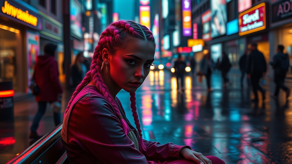A melancholic woman with glowing neon pink braided hair sits on a dimly lit bench, her harlequin attire contrasting the cyberpunk city's hustle behind her. Heavy eyeliner accentuates her sad eyes, reflecting the vibrant city lights. The cinematic ambiance captures ultra-realistic details in 4k, enveloping the scene in a surreal atmosphere. Passersby, mere silhouettes, bustle in the background as rain-soaked streets glisten with the hues of holographic billboards, adding depth to this immersive cityscape.