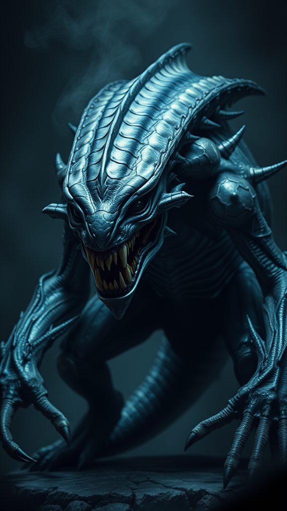 A menacing alien creature, full body, exuding an aura of fear and intimidation, intricately detailed and hyper-realistic features, piercing eyes, sharp fangs, and spiked armor-like skin, its powerful stance suggesting an imminent attack, amidst a dark, eerie environment, evoking a sense of both wonder and dread.
