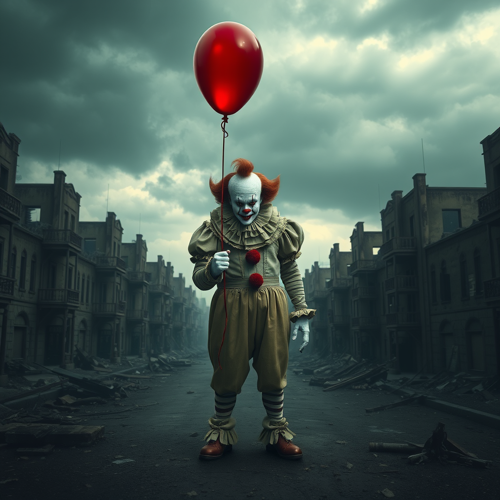 A menacing clown similar to Pennywise holds a red balloon, standing amidst a dystopian post-apocalyptic landscape filled with crumbling buildings, reminiscent of a scene from the IT movie, captured in photorealistic detail, with a dark and stormy sky enhancing the eerie atmosphere.