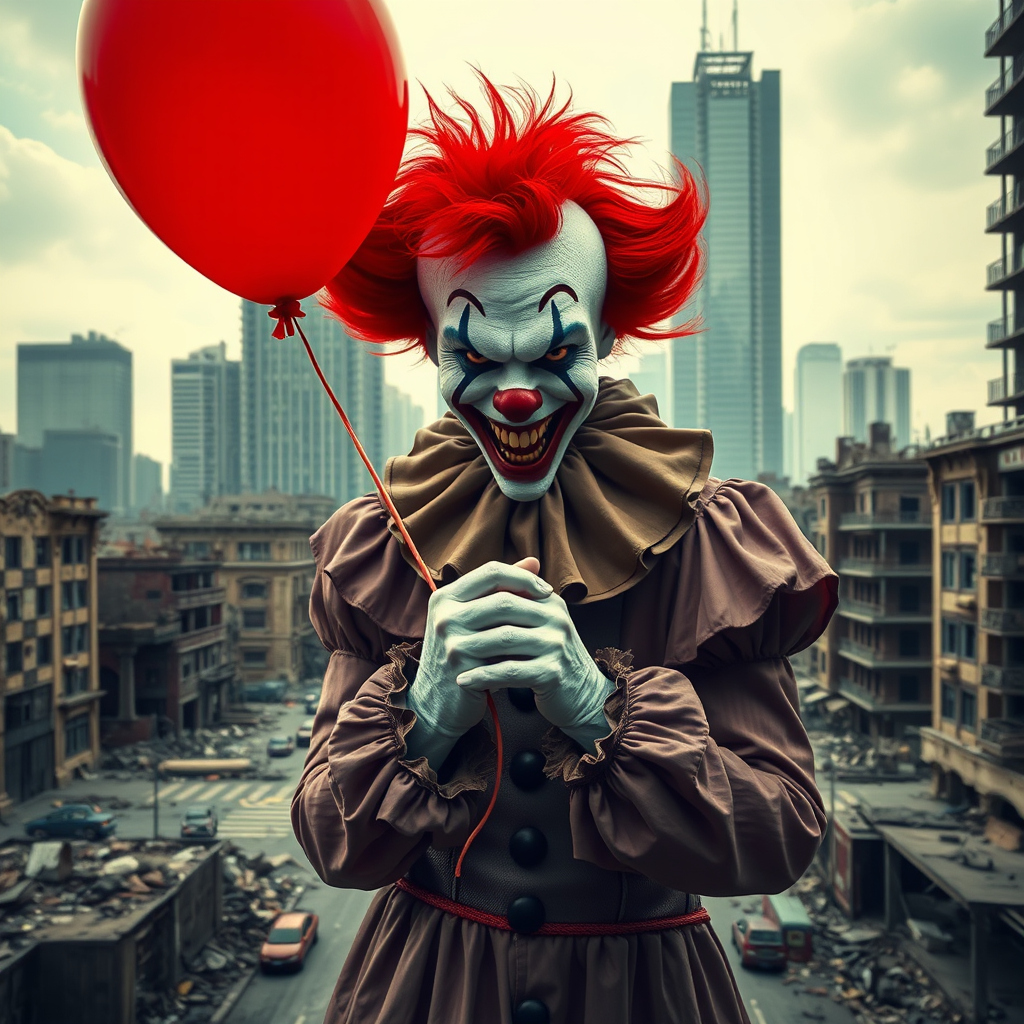 A menacing clown with bright red hair and a wide, sinister grin holds a vibrant red balloon amidst a desolate, dystopian cityscape. The background reveals crumbling skyscrapers and abandoned streets, evoking a sense of eerie silence and decay. Inspired by a cinematic universe, the scene captures photorealistic details with haunting precision, transforming the city ruins into a vivid tableau of chaos and despair.