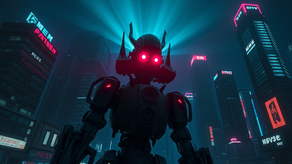 A menacing Cyberpunk automaton towers ominously against the backdrop of a neon-lit futuristic metropolis, its aura radiating malevolence amidst the dark cityscape. Sinister and foreboding, the scene draws from a gritty, shadowy environment where high-tech meets dystopian elements. Captured with a mirrorless camera using an ultra-wide lens at night, the image carries a low realism level in a 2.35:1 aspect ratio. The manual mode settings include a shutter speed of 1/60, an aperture of f/2.8, and an ISO of 3200. Post-processing involves dramatic color grading, subtle vignette, and intentional light leaks to accentuate the eerie, cyberpunk aesthetic.