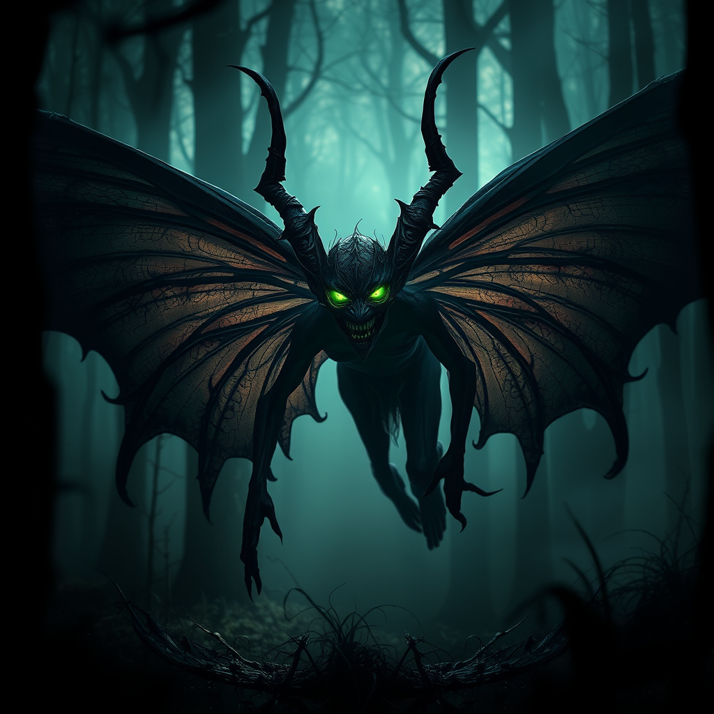 A menacing dark fairy with large, ominous wings lurks in the shadowy depths of the forest, her piercing emerald eyes glowing with an eerie intensity. Mist clings to the trees, adding to the unearthly and sinister atmosphere. Her appearance is both demonic and unholy, with an intricate and elaborate design that exudes a sense of dread. Dramatic and moody lighting casts deep shadows and highlights the fairy's terrifying features in a photorealistic and cinematic style, capturing every terrifying detail of her malevolent presence.