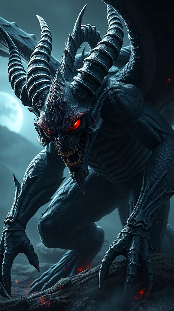 A menacing demon hunter, incredibly detailed and hyper-realistic, rich textures, high-definition 3D, featuring intricate micro details, cinematic quality, 4k resolution, dark and brooding atmosphere, surreal elements, dynamic composition, set in a haunting landscape, vivid color contrast, emphasizing both the power and the elegance of the creature.