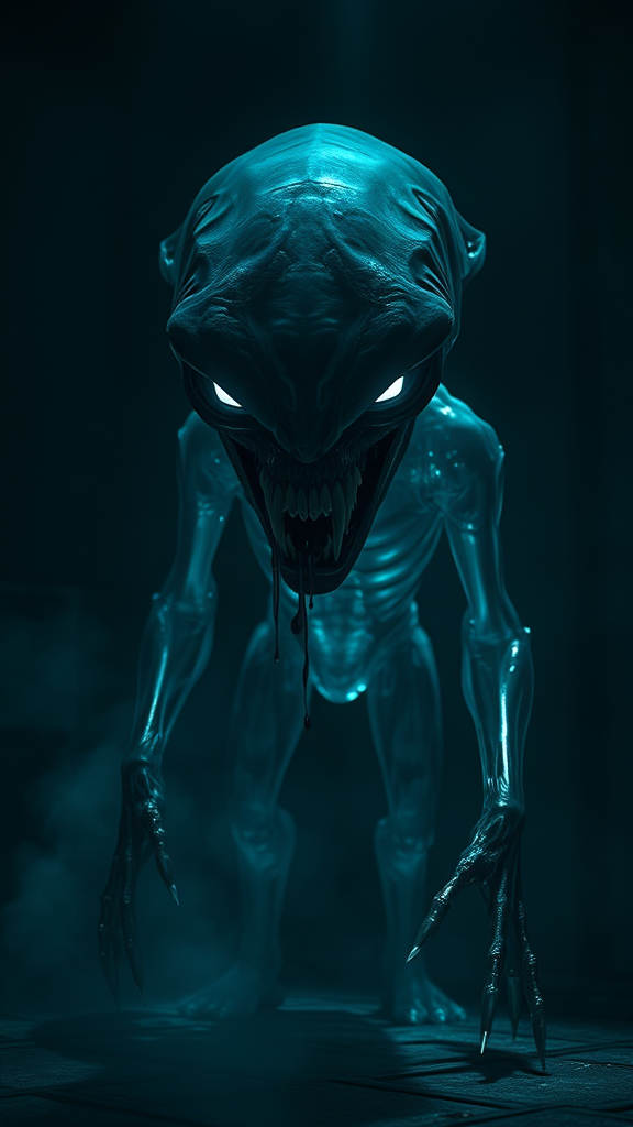 A menacing extraterrestrial being with luminescent neon eyes stands menacingly in a shadowy corner of an ominously dim room, its low growl echoing as drool drips from its razor-sharp fangs. Possessing a soul of pure malevolence, the creature's semi-transparent form adds a ghostly eeriness to its presence. The atmosphere is saturated with a sense of dread and horror, accentuated by an intricate, detailed design that captures intricate textures and features. Bathed in dramatic lighting, the setting emphasizes the creature's terrifying essence, appearing almost lifelike. This photorealistic portrayal, crafted with cinematic precision in stunning 8k resolution, evokes an epic, hyper-realistic quality reminiscent of Unreal Engine 5.2's most impressive visuals, blurring the lines between reality and nightmare.