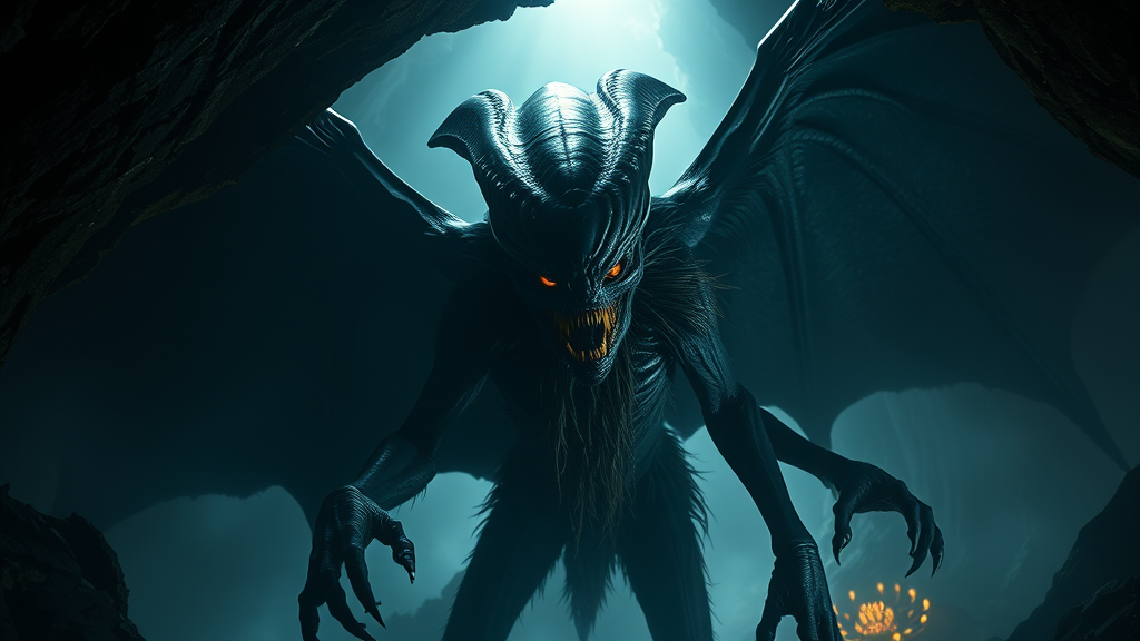 A menacing extraterrestrial being with vast bat-like wings, a shaggy ebony torso, and elongated limbs with talon-like claws, emerges menacingly from a shadowy mist-enshrouded cavern. Its grotesque visage boasts a nightmarish mouth filled with dagger-like teeth, and its lethal, glowing ember eyes pierce through the gloom. The scene, rich in intricate detail and dark horror aesthetics, is accentuated by dynamic, dramatic lighting. The photorealistic and cinematic presentation, with fine cinematic grain, captures the alien's terrifying presence in stunning 8k resolution.