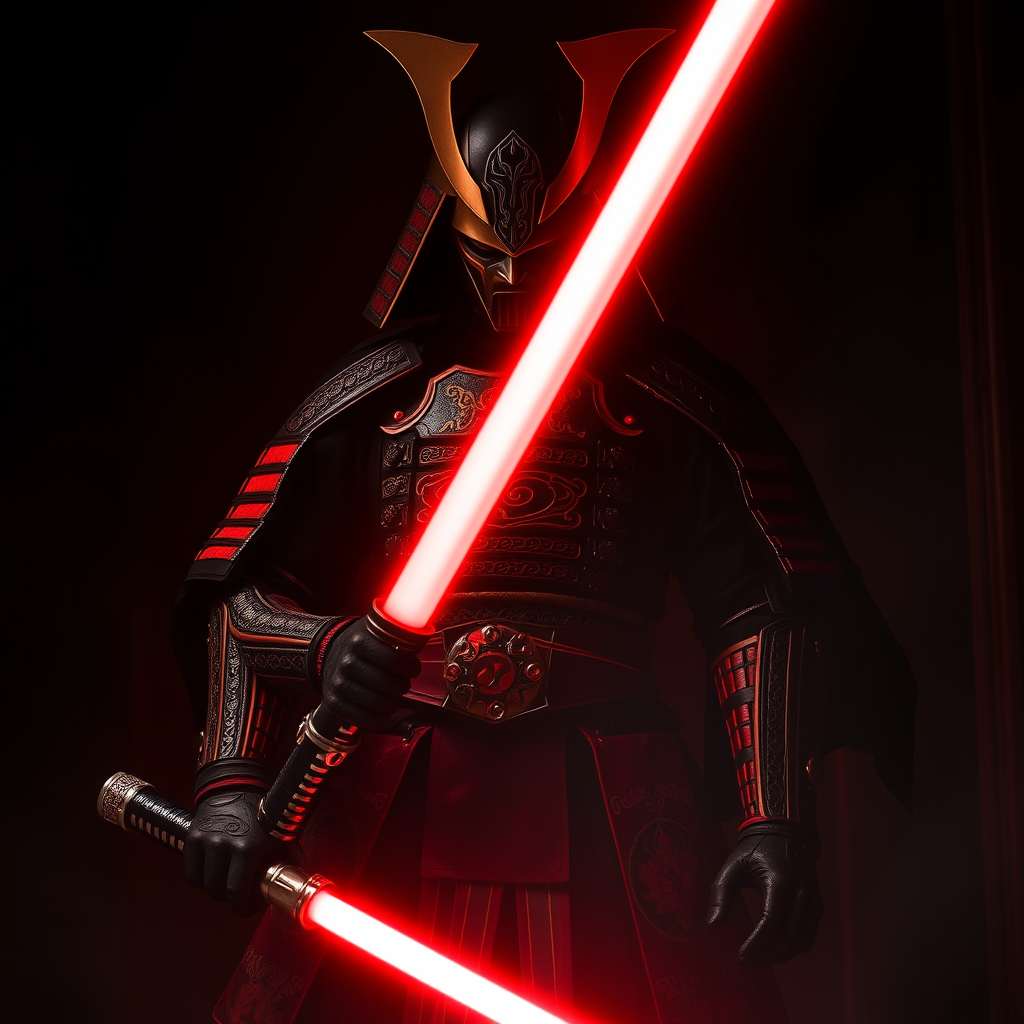A menacing figure stands in the shadows, adorned in ornate black and crimson samurai armor that glints ominously under dramatic, cinematic lighting. His presence is both regal and terrifying, a fusion of ancient warrior artistry and futuristic technology. In his hand, he wields a glowing lightsaber, its red blade casting an eerie glow over his intricately detailed armor. The dark surroundings amplify his formidable aura, merging the spirit of the samurai with the dark enigma of a galactic enforcer.